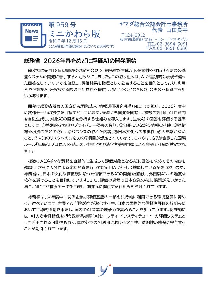 【第959号】総務省 2026年春をめどに評価AIの開発開始