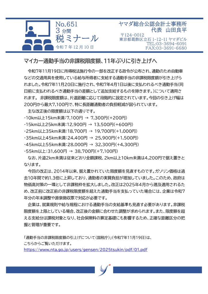 【No.651】マイカー通勤手当の非課税限度額、11年ぶりに引き上げへ
