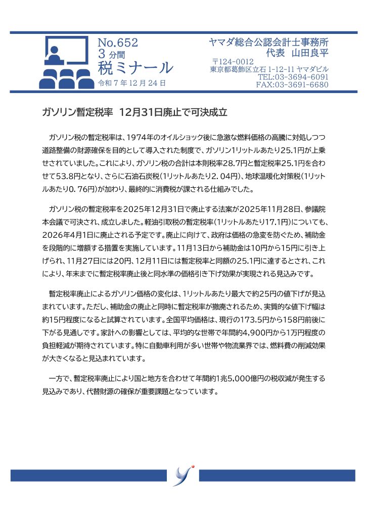 【No.652】ガソリン暫定税率 12月31日廃止で可決成立