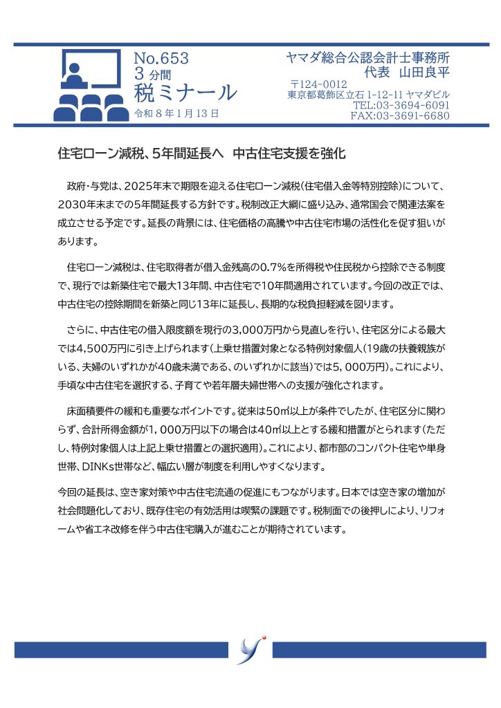 【No653】住宅ローン減税、5年間延長へ、中古住宅支援を強化