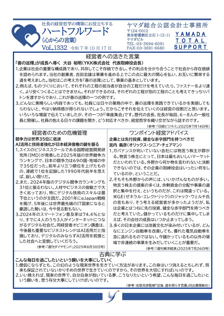 2025年10月17日 / 最終更新日時 : 2025年10月17日 人事労務事業部 ハートフル・ワード~社長の経営哲学の構築に~ 【VoL.1332】「善の巡環」が成長へ導く 大谷裕明(YKK株式会社代表取締役会長)