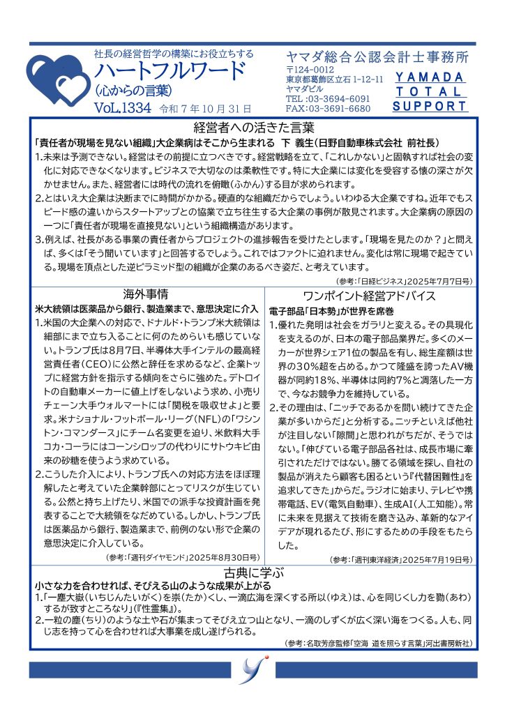 2025年10月31日 / 最終更新日時 : 2025年10月31日 人事労務事業部 ハートフル・ワード~社長の経営哲学の構築に~ 【VoL.1334】「責任者が現場を見ない組織」大企業病はそこから生まれる 下義生(日野自動車株式会社 前社長)