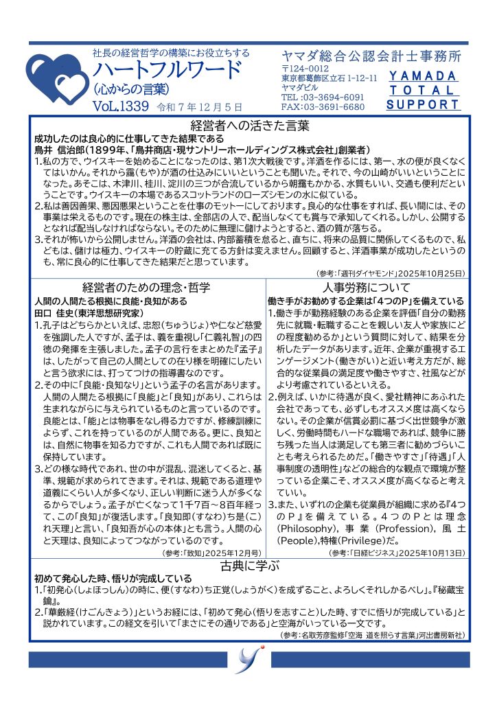 2025年12月5日 / 最終更新日時 : 2025年12月5日 人事労務事業部 最新記事NEWS 【VoL.1339】成功したのは良心的に仕事してきた結果である 鳥井信治郎(1899年「鳥井商店・現サントリーホールディングス株式会社」創業者)