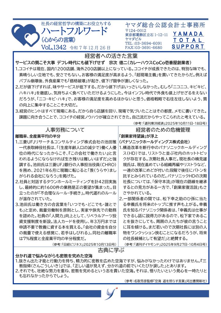 2025年12月26日 / 最終更新日時 : 2025年12月26日 人事労務事業部 ハートフル・ワード~社長の経営哲学の構築に~ 【VoL.1342】サービスの質こそ大事 デフレ時代にも値下げせず 宗次徳二(カレーハウスCoCo壱番屋創業者)