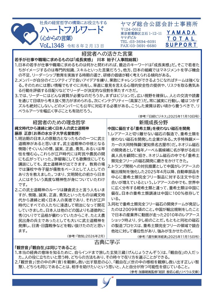 2026年2月13日 / 最終更新日時 : 2026年2月13日 人事労務事業部 ハートフル・ワード~社長の経営哲学の構築に~ 【VoL.1348】若手が仕事や職場に求めるものは「成長実感」川本裕子(人事院総裁)